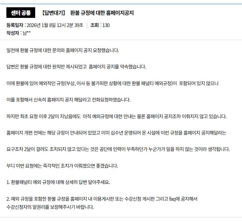 센터 공통 【답변완료】 환불 규정 홈페이지 공지 재요청(3개월이상시정안됨)