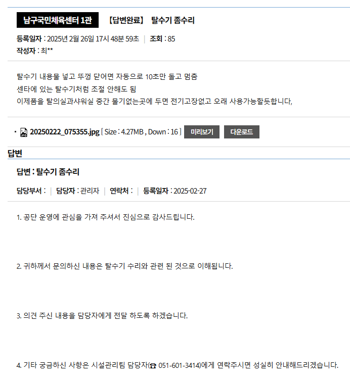 남구국민체육센터 1관 【답변완료】  1관 남자샤워실 샤워기 및 탈수기 재건의 드립니다.