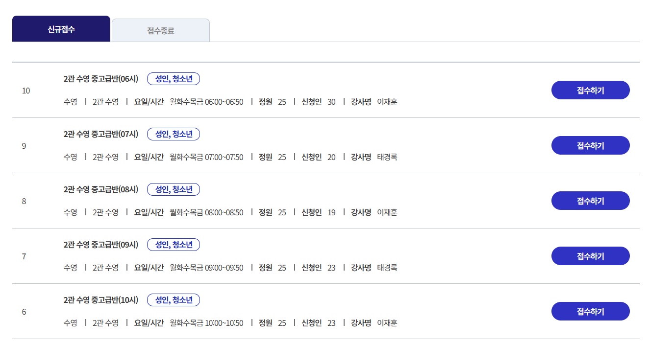 수강 신청할 때 표시 되는 것이 신규접수 클릭하면 (예시) 0관 수영 중고급반(06시) 수영/2관수영/요일/시간 06:00~06:50/정원 25 / 신청인 30 / 강사명 000 이렇게만 나옵니다. 정원이 그 수업 듣느 사람 총 인원 일테고 신청인은 재수강 신청한 분들도 포함된 인원일까요?(정원, 신청인에 대한 의미가 애매합니다;;) 홈페이지 바뀌기 전에는 재수강 인원 말고 남은 자리에 대한 잔여 인원이 표시되었고, 신규 신청 인원이 표시되어 대략 어느 정도의 경쟁이 되는지 확인 가능했다면 새로운 홈페이지에서는 아무리 찾아봐도 알수가 없습니다. (혹시 제가 못 찾은 거였다면 어디서 확인 가능한지 알려주시기 바랍니다.) 클릭해서 들어가도 보이는 것은 "정원... 신청인..." 이렇게만 보입니다. 같은 문의를 아래 글에서 본 것 같은데 어디에 잔여 인원이 표시 되어 있는지 저도 찾지 못해서 다시 여쭤봅니다. ※ 제가 보이는 화면(수강신청 화면)을 캡쳐해서 첨부 했습니다. 확인 부탁드립니다.