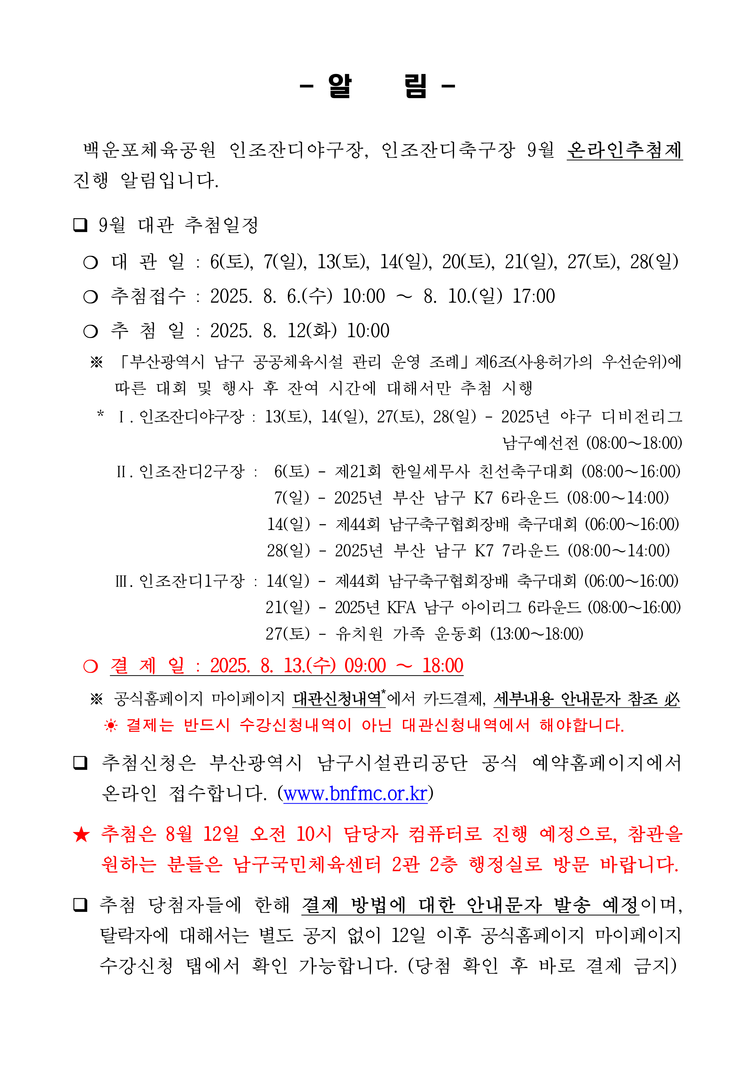 백운포체육공원 9월 추첨 신청 안내입니다.