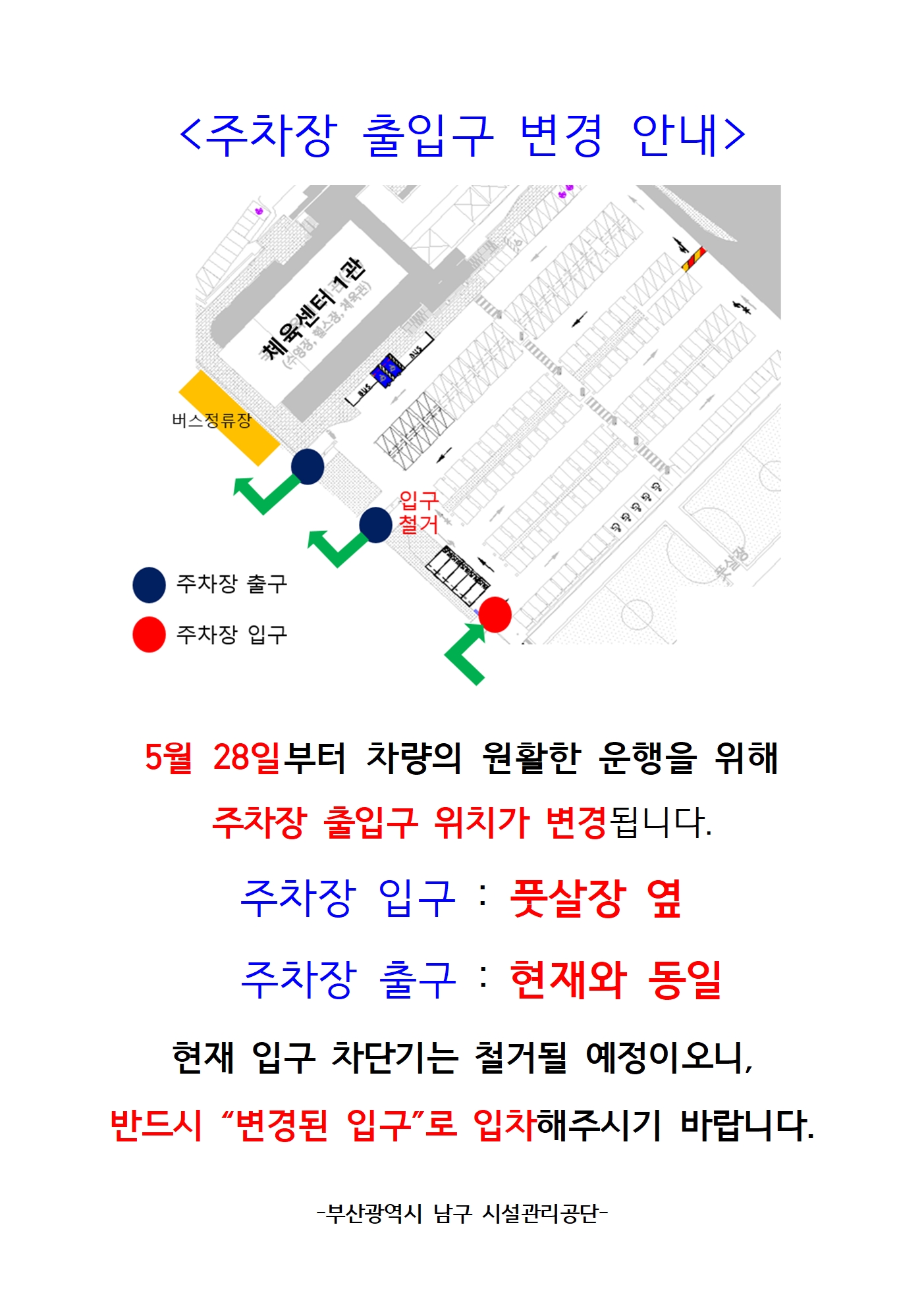 1. JPG 파일 주차장 입출구 변경_안내문001001.jpg [ Size : 639.12KB , Down : 84 ] 미리보기 다운로드