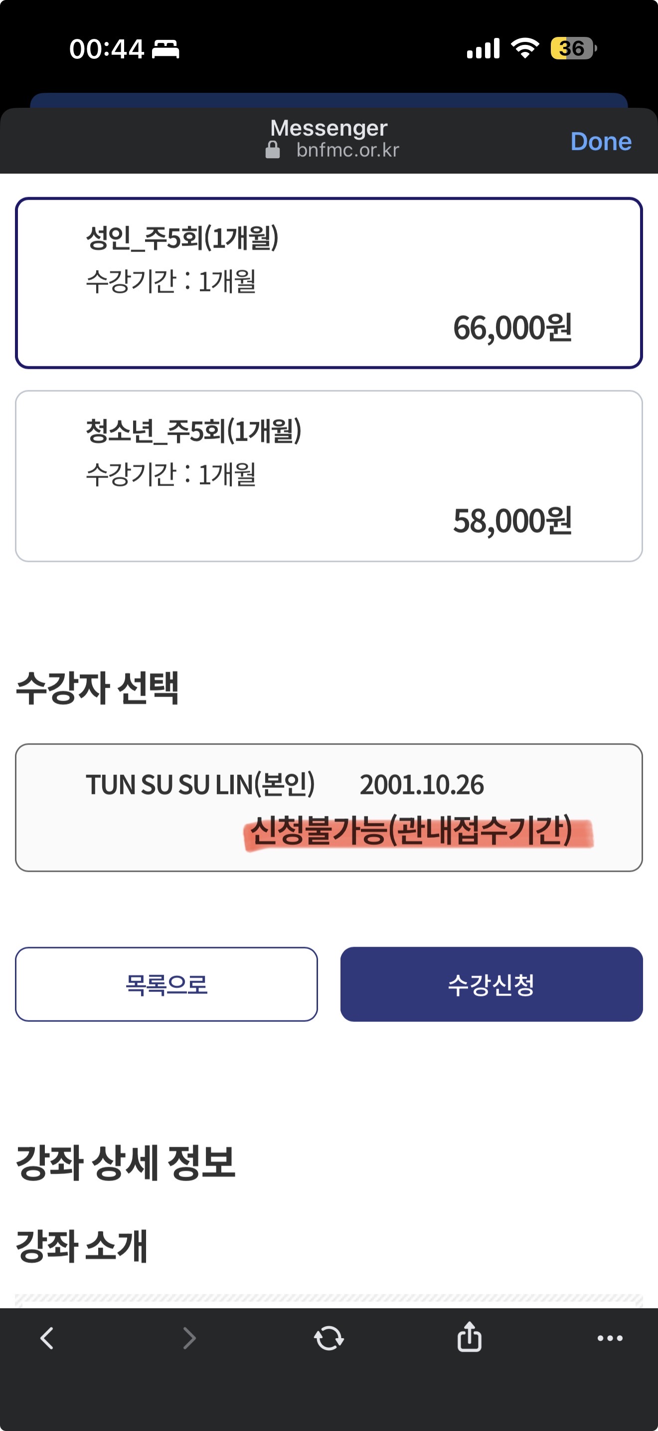 안녕하세요. 저는 외국인인데요, 수영 강의를 신청하려고 했는데 신청이 불가능하다고 떠서 문의드립니다.